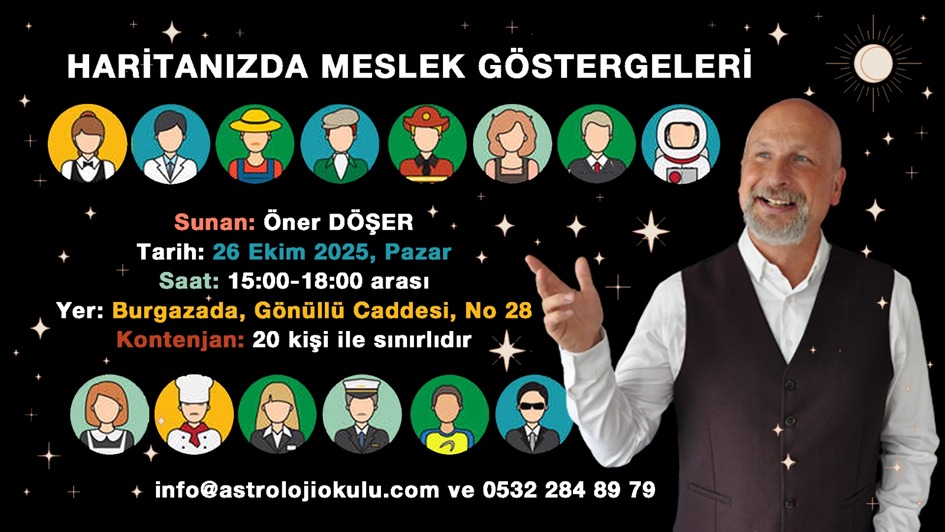 Astroloji Okulu Burgazada’da yapacağımız bu çalıştayda önce bir haritadaki meslek göstergelerinin saptanması ve bunlar arasında potansiyeli en güçlü olanın seçilmesi ve tüm göstergelerin bir arada kullanılması konusundaki kuralları göreceğiz. Daha sonra bu kuralları katılımcıların haritaları üzerinde tatbik edeceğiz. Pratik çalışmaların daha hızlı akması açısından, haritası üzerinde çalışılmasını isteyen katılımcıların doğum bilgilerini önceden göndermelerini rica edeceğiz. Katılım için detaylı bilgi linkte https://astrolojiokulu.com/tr/portfolio/haritanizda-meslek-gostergeleri/