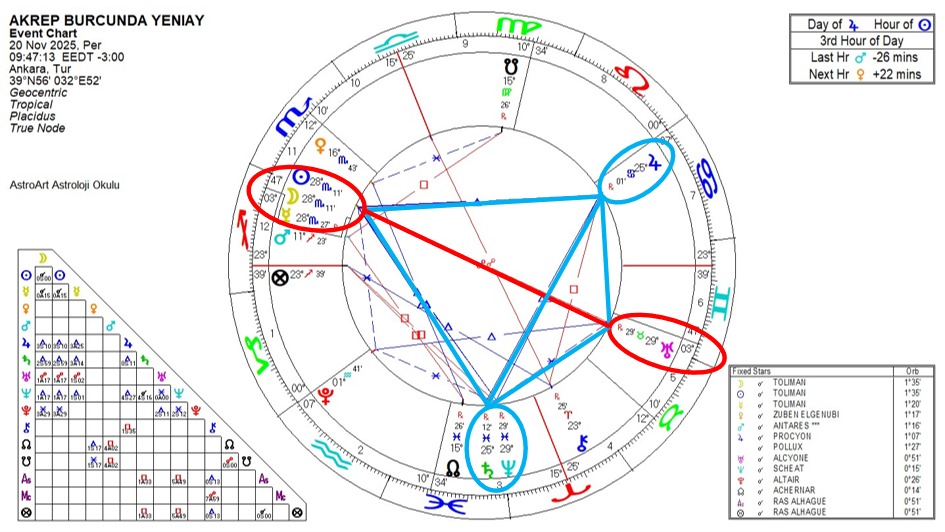 20 Kasım yeniayı ve Merkür Toliman yıldızı ile hizalanıyor. Toliman iyicil bir yıldızdır ve Jüpiter-Venüs karakterindedir. Öğrenme, eğitim ve de tinsel gelişimle ilişkilendirilebilir. Deneyimler yoluyla hayat derslerinde ilerlemenin diğer yollarına açık olmayı öğrenmeyi ve bilgeleşmeyi sembolize eder. Şehvet, dedikodu ve skandal yaratan enerjiler de içerir. (Brady). İyilik, arkadaşlar, zarafet ve itibarlı bir mevki verir. (Robson)