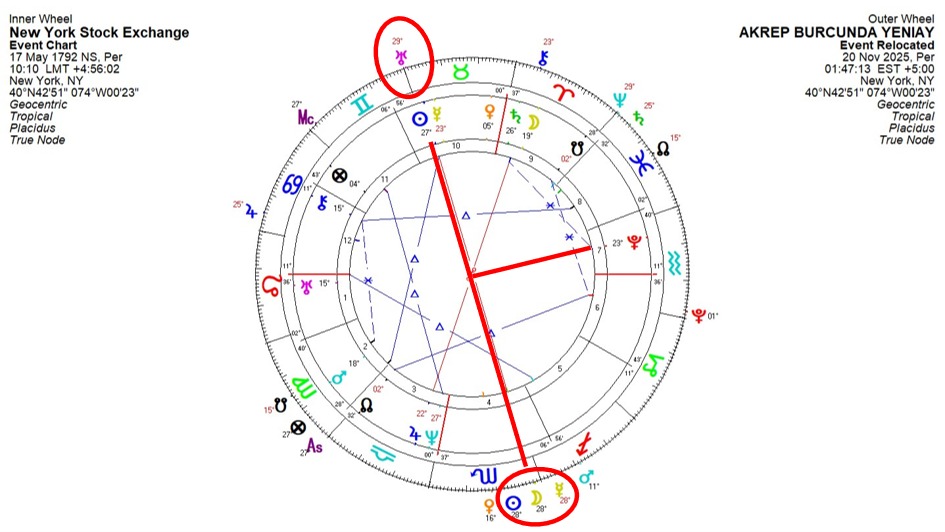 28 derece Akrep burcunda Merkür ve Uranüs ile dizilimde gerçekleşecek sarsıcı yeniay, finans alanında da sarsıntılara işaret ediyor. Yeniay astroloji haritası New York Menkul Kıymetler borsası astroloji haritasını da tetikliyor. Borsada bir sarsıntı olabilir ve diğer piyasaları da etkileyebilir. Tabii bizim borsamız a etkilenebilir. Temkinli olmakta fayda var!