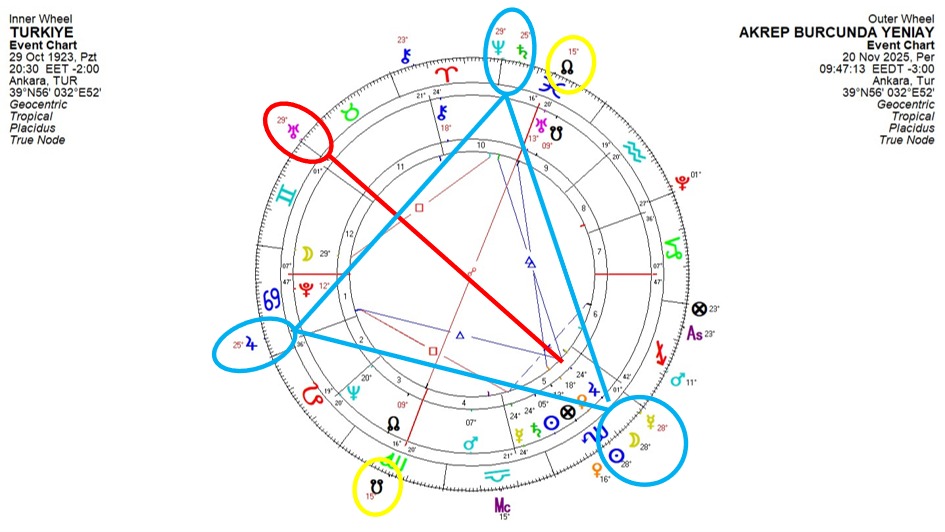 Akrep yeniayı ülkemiz astroloji haritasının çocuklar, gençler, sanatçılar, sporcular, aracılarla, borsa ve spekülasyonla ilişkilendirilen 5.evini etkiliyor. Merkür-Uranüs karşıtlığında gerçekleşeceği için, borsada çalkantı oluşabilir. Beklenmedik düşüşler yaşanabilir. Bunlar Milletvekilleri ve Meclis ile bağlantılı gelişmeler akabinde de görülebilir. Zira Uranüs geçişi ülkemiz astroloji haritasının 11.evini etkiliyor ve Meclis, Milletvekilleri, Anayasa, ittifaklar, partilerle ilgili konularda bazı beklenmedik veya sıra dışı gelişmelere atıfta bulunuyor. Çok sayıda gezegenin Retro olduğu bu yeniay civarındaki günlerde Ay Düğümleri de ülkemiz haritasının kadersel (MC/IC) eksenini tetiklediğinden, eskiden beri gelen bazı şeylerin değişimine, farklı bakış açılarının ortaya çıkacağına işaret edebilir. Geçmişte yadsınan bazı şeyler şimdilerde farklı bir konseptte karşımıza çıkabilir veya bize sunulabilir.