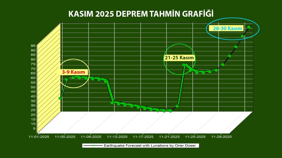 Kasım ayındaki gezegen hareketlerine dayalı olarak çizdirilmiş grafikte görüldüğü üzere, 3-9 Kasım arasındaki günlerde grafikte yükseliş var. O günlerden bu yana Balıkesir tarafında orta büyüklükte depremler oluyor. 9 Kasım’da Japonya’da 6.8 büyüklüğünde deprem oldu. Ertesi gün de 6.0 oldu. Grafikte ikinci dikkat çeken 21-25 Kasım arasındaki tarihlerde sismik aktivite artışı olasıdır. Etkili depremler görülebilir. Ayın sonlarında 28-30 Kasım arasındaki tarihler de hayli dikkat çekici gözüküyor.