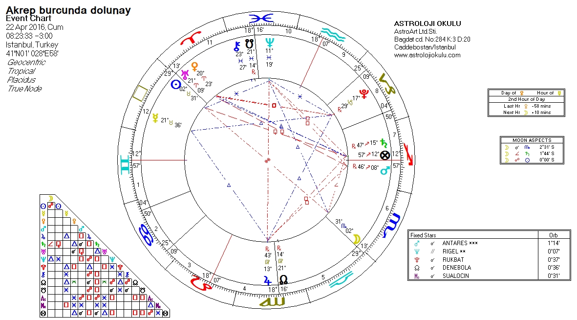 Ay ve Güneş’in karşıtlığının kesinleştiği an için çizdirilmiş astroloji haritasında İkizler burcu yükselmekte ve dolunay 2 derece Akrep burcuna, haritanın 6. Evine izdüşmekte. Aşağıda bu haritayı görmektesiniz.