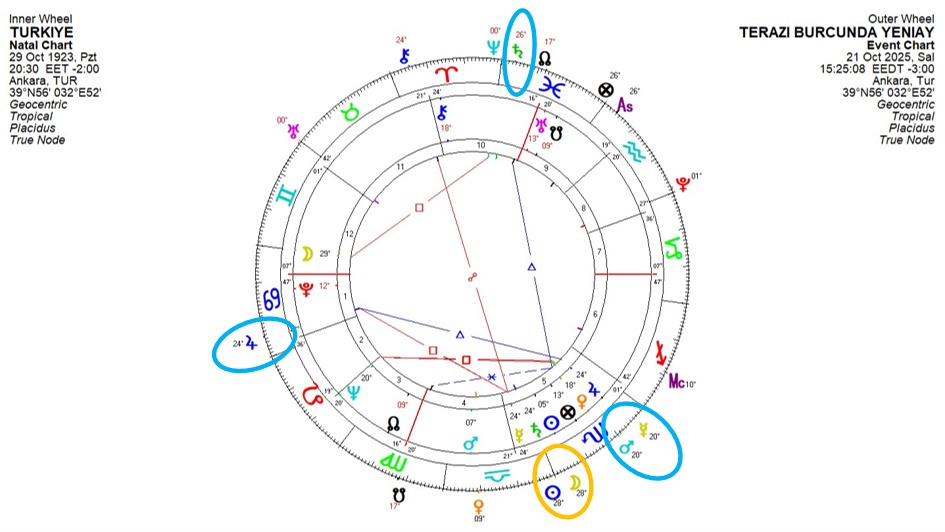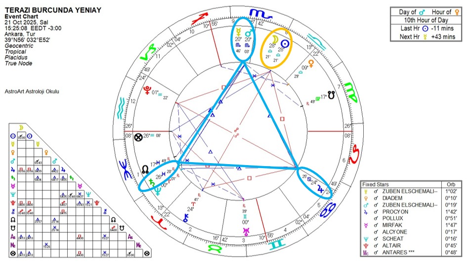 Terazi burcundaki yeniay ülkemiz astroloji haritasının Merkür-Satürn kavuşumunu tetikliyor. Dolayısıyla hak, hukuk, adalet konularına vurgu yapıyor. Yargıya intikal etmiş konularda önemli gelişmelerin olacağını gösteriyor. Yeniay esnasında etkili olan ve 24 Ekim’de kesinleşen Merkür-Jüpiter üçgeni, ülkemiz astroloji haritasının Jüpiter derecesini olumlu etkiliyor. Dolayısıyla yargı organlarının ve hukuki konularla ilgili karar mercii olan kişilerin hakkaniyetle yargılama, kararlar verme olasılığını arttırıyor.