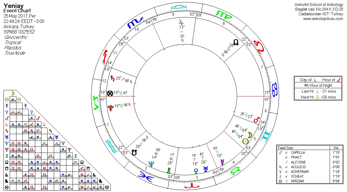 25 Mayıs Perşembe gecesi 4 derece İkizler burcunda bir yeniay meydana geliyor. Ankara’ya göre çizdirilmiş yeniay haritasında Oğlak burcu yükselmekte, yeniay haritanın 5. Evine (6. Burcuna) denk düşmekte. Aşağıda bu haritayı görmektesiniz.