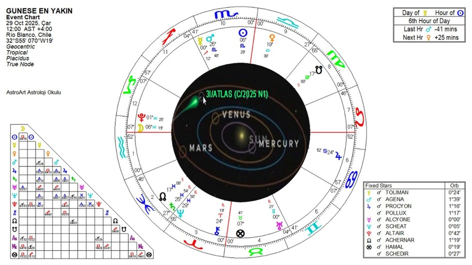 NASA’nın kuyrukluyıldız olarak tanımladığı, bazı komple teorisyenlerinin ise bir uzay aracı olarak ifade ettiği bu göksel obje üzerine çok şey yazıldı, söylendi. Bunlardan pek çoğu asılsız haberler ve görüntülerdi. 3I/ATLAS Güneş’e en yakın geçişini 29 Ekim’de yapacak. Çıplak gözle izlenemeyecek, ancak teleskoplarla izlenebilecek, ama Güneş’in arkasında kalacağından, bu şekilde de çok net izlenemeyebilir. Güneş’ten uzaklaşmaya başladıkça daha net görüntüler alınabilir. Neyse, bizim işimiz, Güneş’e en yakın geçişini (210 milyon kilometre) yapacağı günün genel değerlendirmesini yapmakla sınırlı kalacak. O gün gökyüzünde Merkür-Uranüs karşıtlığı var. Bu karşıtlık Yay/İkizler ekseninde gerçekleşecek. Dolayısıyla bilgi akışı yoğun olacak. Bu karşıtlık ani ve beklenmedik olaylara, daha evvelce fark edilmemiş olan bazı şeylerin keşfine ve idrakine, ezber bozan nitelikte bilgilere ulaşılmasına işaret ediyor olabilir. İnsanlarda uyanışa sebep olan bir tetikleyici işlevi görebilir. 3I/ATLAS’ın Dünya’ya en yakın olacağı 19 Aralık’ta ise 270 milyon kilometre mesafede olacak. O zaman yaklaştığında haritasını astrolojik açıdan değerlendireceğim.
