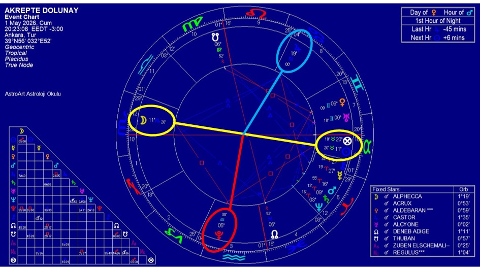 1 Mayıs Cuma akşamı Türkiye saatiyle 20:23’te Akrep burcunda dolunay gerçekleşiyor. Büyüme aşamasının zirve noktasına vardığı ve olayların da büyüme eğiliminin doruklarını test edeceği bu zaman diliminde, Ay’ın ufuk düzlemine yakın denk düştüğü bizim de bulunduğumuz bölgede önemli gelişmeler bekleyebiliriz. Bunlar, halkımızın sağlığı ve güvenliği ile ilgili konularda olabilir. Sismik aktivite de artabilir. Bu bağlamda Ege ve Marmara bölgeleri özellikle dikkat çekiyor.