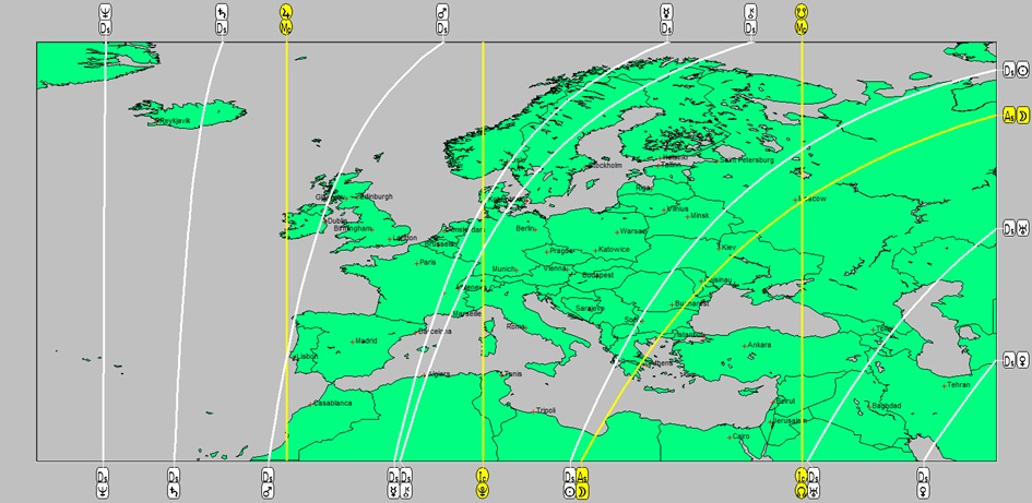 Dolunayın gezegen iz düşümlerini gösteren coğrafi haritada İngiltere’de yine genişleme, büyüme, avantaj sağlama yönünde bir enerji akışını görüyoruz. İspanya üzerinden de geçen olumlu hatlar, belki de buradaki genişlemeyi destekleyecek.
