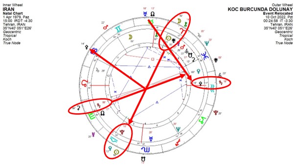 Kiron ile kavuşan dolunay derecesi, İran astroloji haritasının Güneş derecesini tetikliyor. Dolayısıyla otorite figürleri üzerinde bir baskı oluşturuyor. Güneş’in 9.evdeki yerleşimi İran’ın dini lideri Hamaney’i temsil ediyor dönem itibariyle. Haliyle onun da üzerinde baskı oluşturacak eylemler, protestolar artabilir. Hamaney’in haritasında zaten Ay-Mars karşıtlığı var. Yani kadınlardan tepki alabilecek bir yerleşime sahip. (17 Temmuz 1939, Meshed-İran) Transit Satürn, İran astroloji haritasının Pallas derecesini baskılıyor. Haliyle kadın figürleri üzerinde baskılanma devam edecektir. Transit Pallas İran haritasının 12.evinden geçiş yapmakta. Bu da bazı kadın figürlerinin topluca alıkonulması veya hapsedilmesi veya perde arkasından baskıya maruz kalması gibi durumlara işaret edebilir. İran astroloji haritasındaki Venüs-Satürn karşıtlığı, genç kadınlar ve özel hayatlarıyla ilgili baskılanmayı da anlatıyor. Önümüzdeki günlerde transit Ceres-Juno karşıtlığı da İran haritasının Venüs-Satürn karşıtlığının üzerinde çalışacak. Haritanın her tarafından kadınlarla ilgili baskılanma, buna mukabil kadınların özgürleşme talepleri ve protestolara yönelik işaretler fışkırıyor adeta!