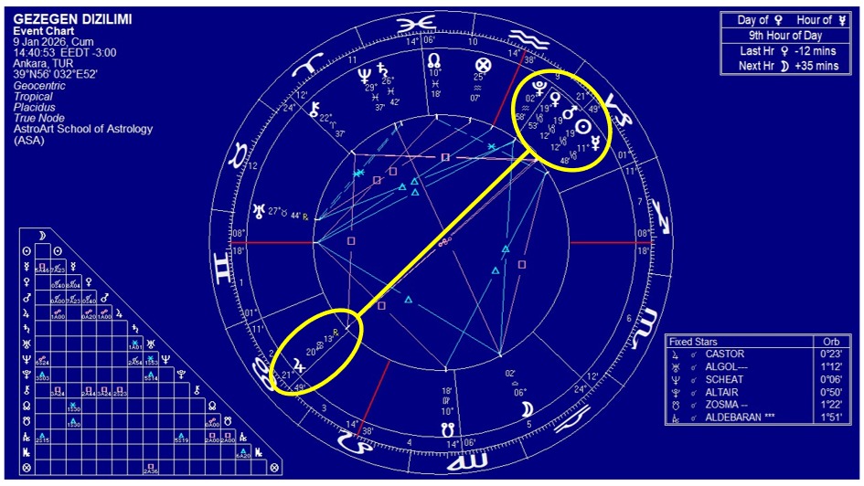 Güneşmerkezli gezegen açılarına baktığımızda, 2 Ocak tarihinden itibaren güneşteki gerginliğin tırmanmaya başlayacağını görüyoruz. Haritanın sağındaki gök günlüğünde görüldüğü üzere, 6 Ocak tarihinden itibaren bariz bir gerginlik artışı olabilir. Etkili güneş patlamalarına ve ardından gelecek jeomanyetik fırtınalara işaret eden bu gezegen açıları 11 Ocak’a kadar çok etkili olacak. Bu geometrik pozisyonlar büyük depremler ihtimalini arttırıyor. 8 Ocak-11 Ocak arası en etkili tarih aralığı diyebiliriz.