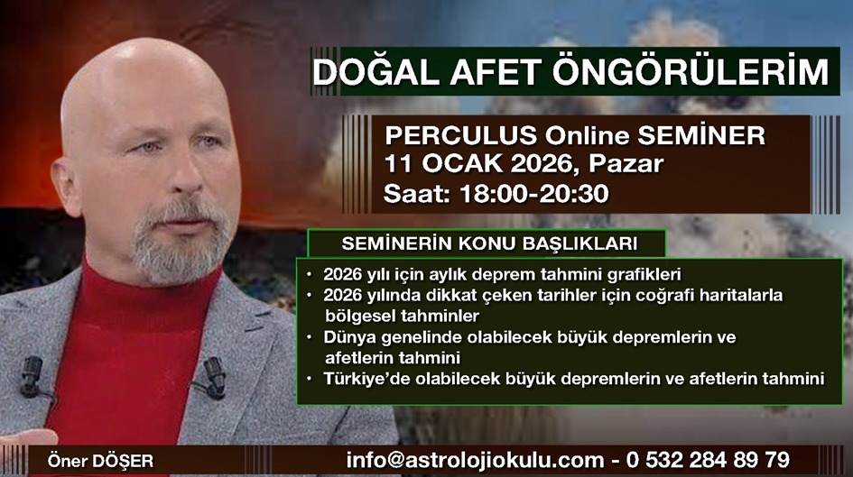 Bu çalışmada astrolog Öner Döşer, öncelikli olarak deprem tahmini üzerine odaklanacak. 2026 yılının her ayı için deprem tahmin grafiğini, coğrafi astroloji haritalarını ve dikkat çeken tarihler için yermerkezli ve güneşmerkezli haritaları kullanarak riskli tarihler için öngörüde bulunacak. Depremlere ilaveten, yanardağ patlamaları, sel, fırtına ve yangınlar gibi afetlerin astrolojik göstergelerine yer verecek. 2026 yılı ve takip eden birkaç yıl için risk taşıyan tarihleri paylaşacak. Detaylı bilgi ve katılım için tıklayınız https://astrolojiokulu.com/tr/portfolio/dogal-afet-ongorulerim-2/
