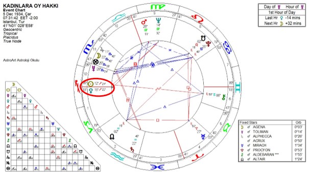 5 Aralık 1934'te Anayasa ve Seçim Kanunu'nda yapılan yasa değişikliği ile kadınların ilk kez oy kullanmasının ve aday olabilmesinin önü açıldığı gün de Yay burcunda Güneş Venüs kavuşumu vardı.
